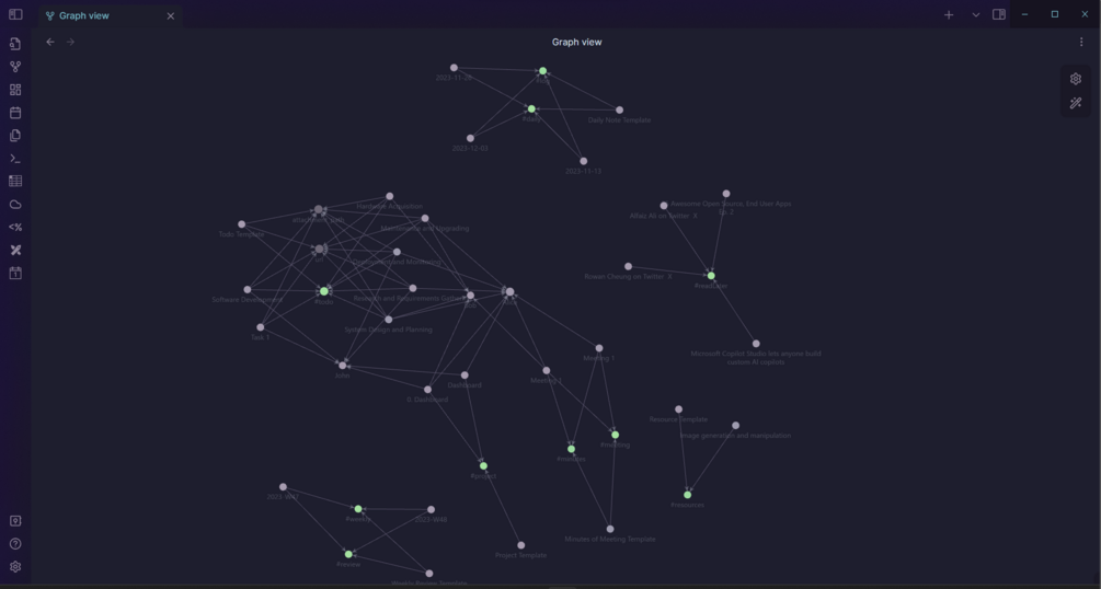 - Visual Project Mapping with Obsidian Canvas: Visualize the interconnections of your projects, tasks, and team members with our Obsidian Canvas integration. This visual tool aids in understanding complex project dynamics and fosters effective team collaboration.