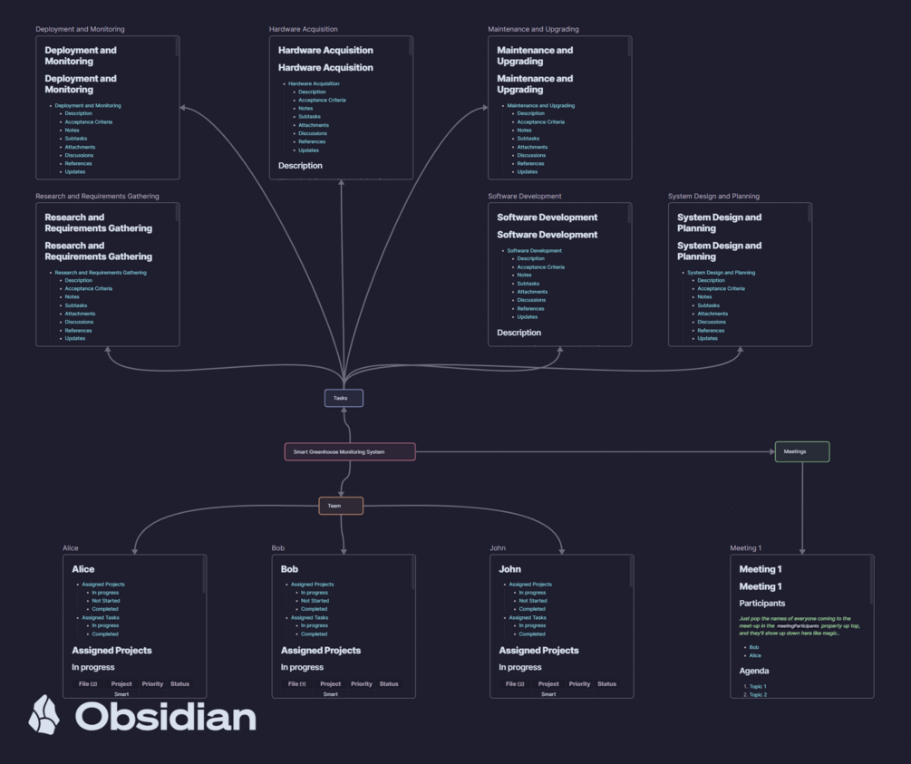 - Visual Project Mapping with Obsidian Canvas: Visualize the interconnections of your projects, tasks, and team members with our Obsidian Canvas integration. This visual tool aids in understanding complex project dynamics and fosters effective team collaboration.
